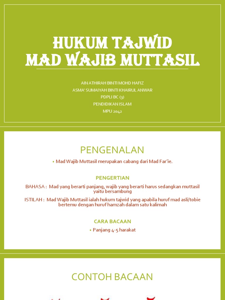 ( وْ ) wau mati sebelumnya berbaris hadapan. Hukum tajwid mad silah,mad munfasil dan mad muttasil група сортиране. Panjang bacaan madnya satu sampai dua setengah alif atau dua sampai lima harakat. Kesimpulan yang dapat diambil yaitu meskipun ada perbedaan pendapat tentang panjangnya bacaan mad wajib muttasil akan tetapi jelas lebih panjang dari cara membaca mad tobi'i. Halaman 41) contoh bacaan mad wajib muttasil