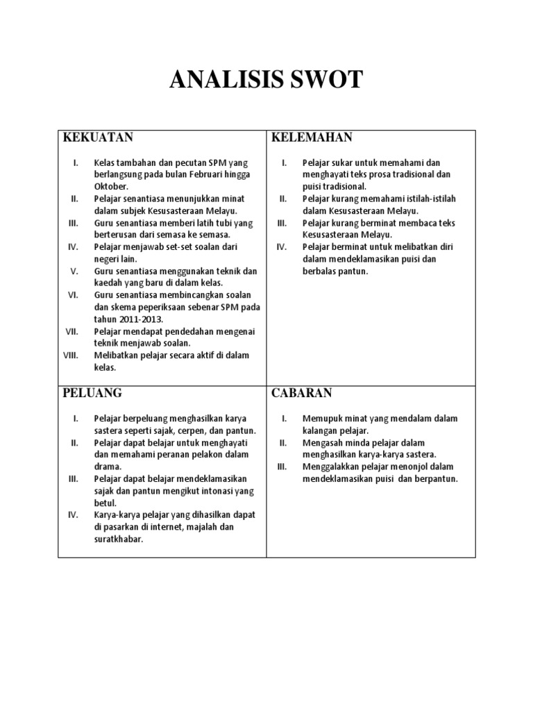 Analisis swot persatuan bahasa melayu. Selaku ketua panitia, saya bertanggungjawab menyediakan semua ini untuk pembentangan di peringkat sekolah dan ppd hilir perak. Analisis swot panitia bahasa melayu kekuatan kelemahan strength weakness kekuatan kelemahan. The copyright of the image is owned by the owner, this website only displays a few snippets of several keywords that are put together in a post summary. Feb 18, 2011 · 2.